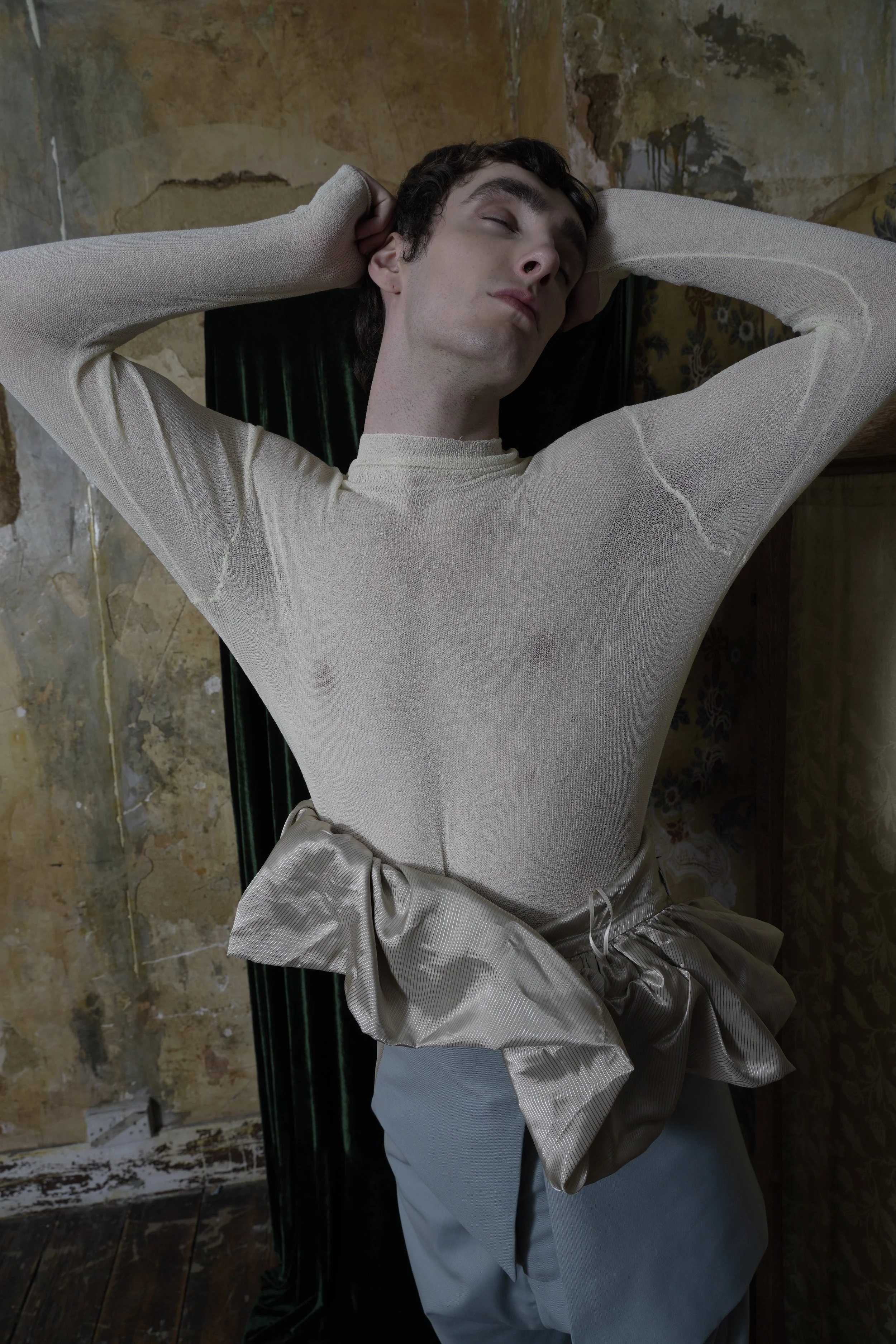 Cream long sleeves knitted mock top, with holes on the sleeves for thumbs.